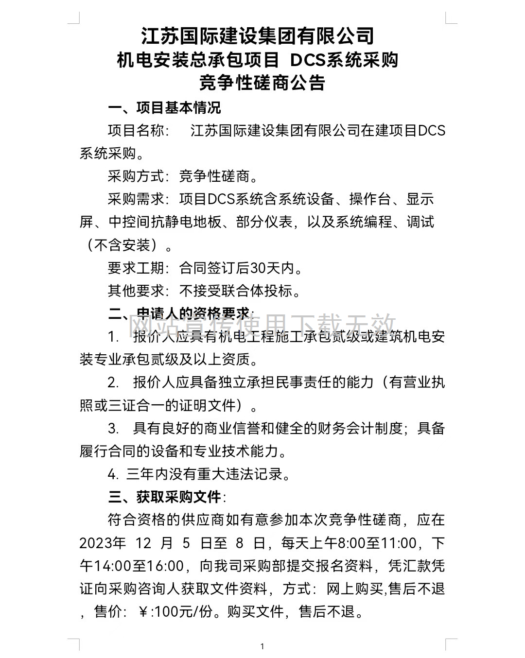 江蘇國際建設集團有限公司 機電安裝總承包項目 DCS系統采購 競爭性磋商公告